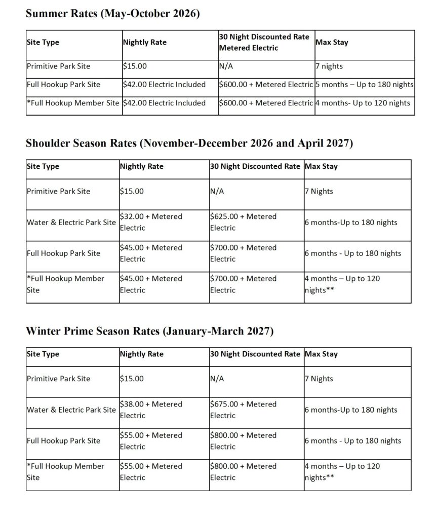 * Members may return to their lot with an 8-day notice. Rental guests on Member Sites may need to relocate if a member returns.